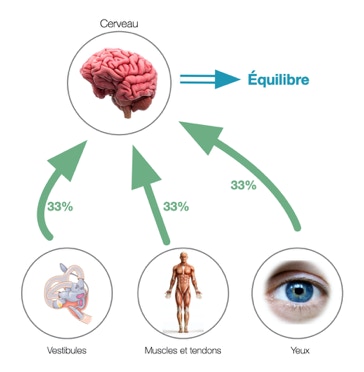 Ces 3 systèmes comportent un certain nombre de capteurs qui envoient des informations au cerveau. Grâce à ces informations, le cerveau est capable de connaître notre position dans l’espace et d’adapter, de corriger ou d’anticiper nos mouvements afin de garder notre corps en équilibre.